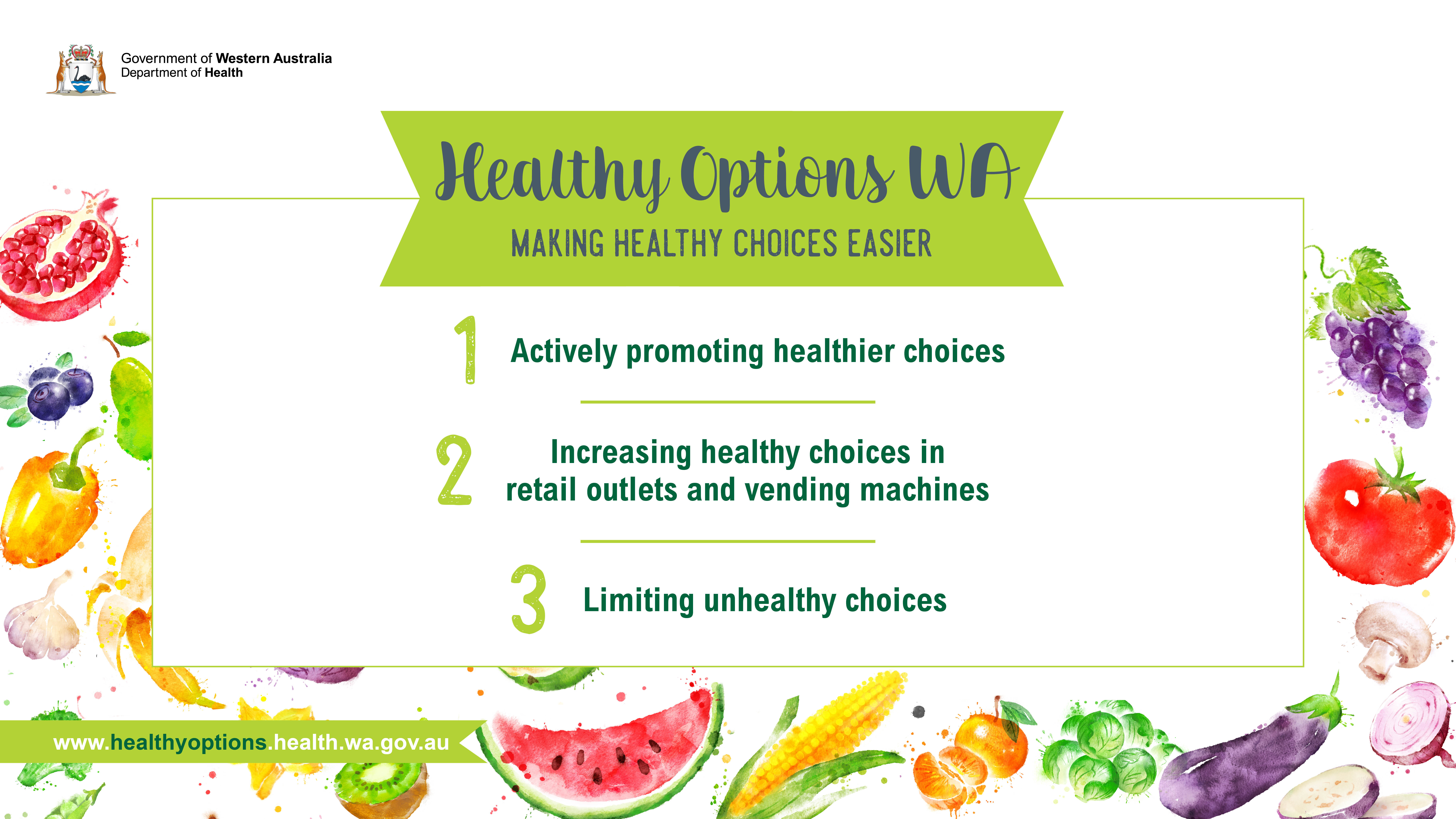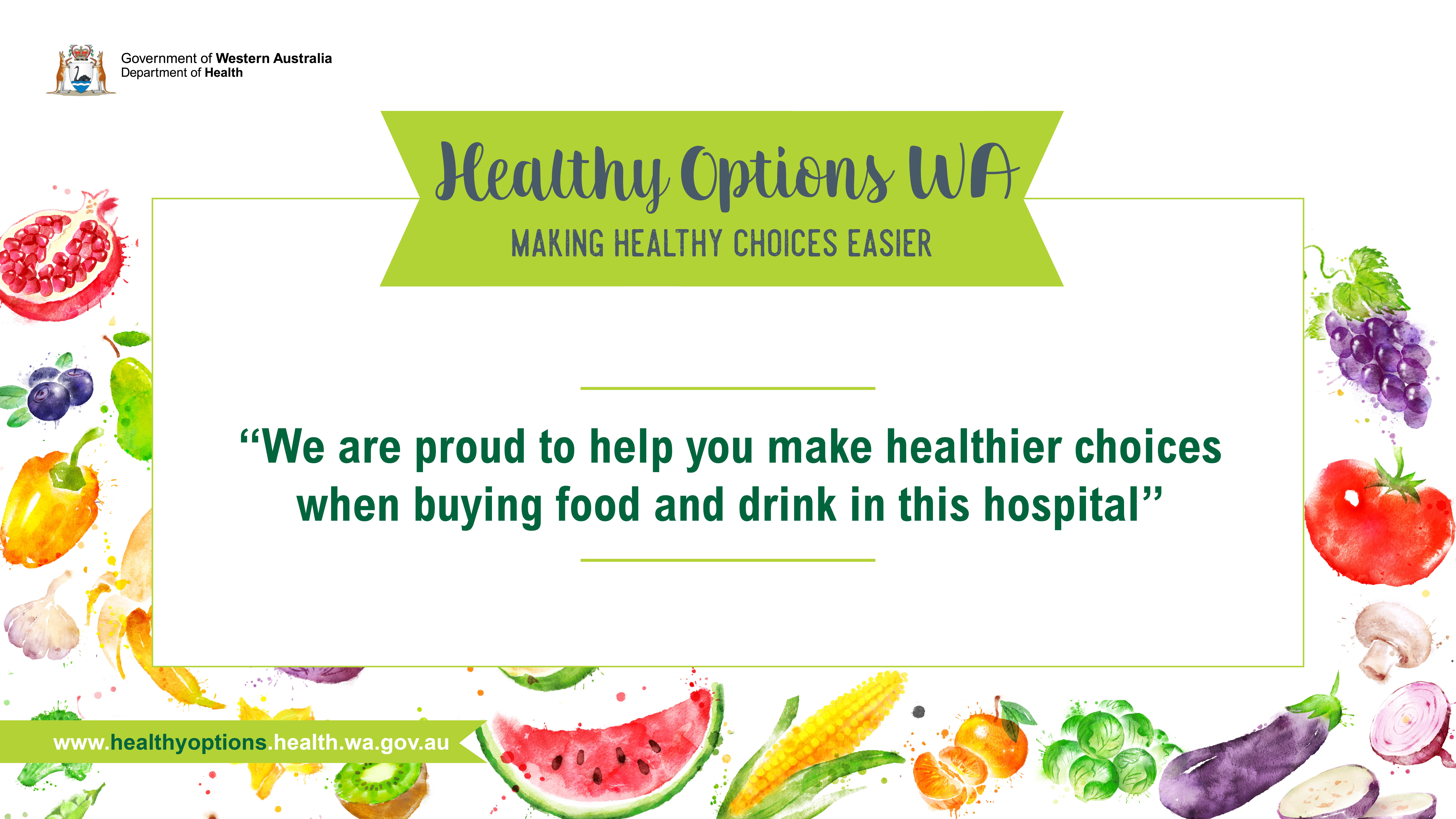 Making healthier choices the easier choice in WA healthcare facilities is everyone’s business. The mandatory Healthy Options WA Food and Nutrition Policy applies to all WA health system entities, including staff and contracted retailers.