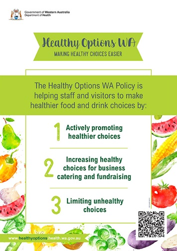 The MP 0142/20 Healthy Options WA Food and Nutrition Policy (PDF 142KB) (the Policy) ensures that the Department of Health and WA hospitals are taking steps to increase the healthy food and drink options for staff and visitors at their sites.