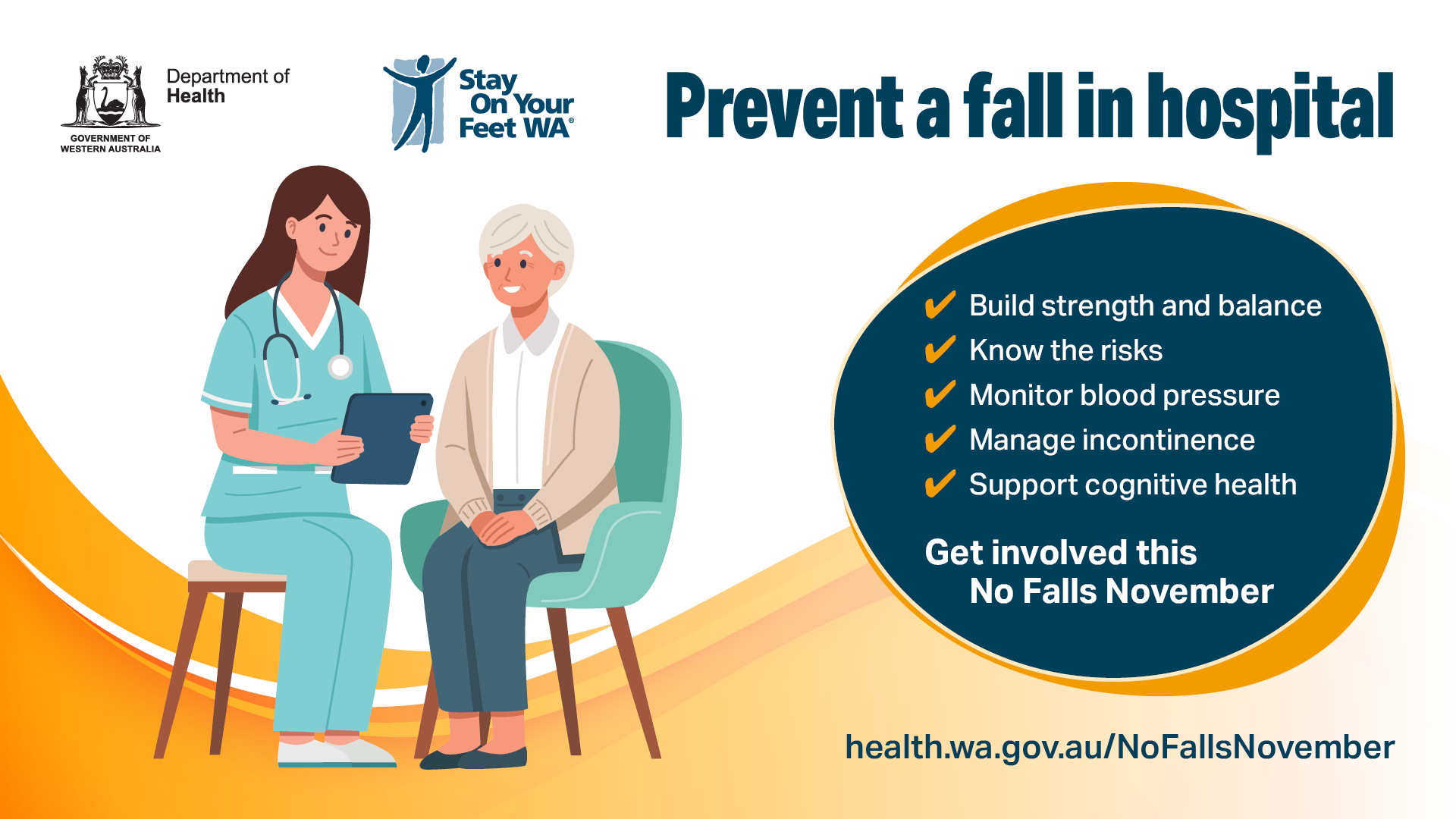 The No Falls November campaign aims to raise awareness of falls prevention amongst people in hospital and residential aged care homes (RACHs).