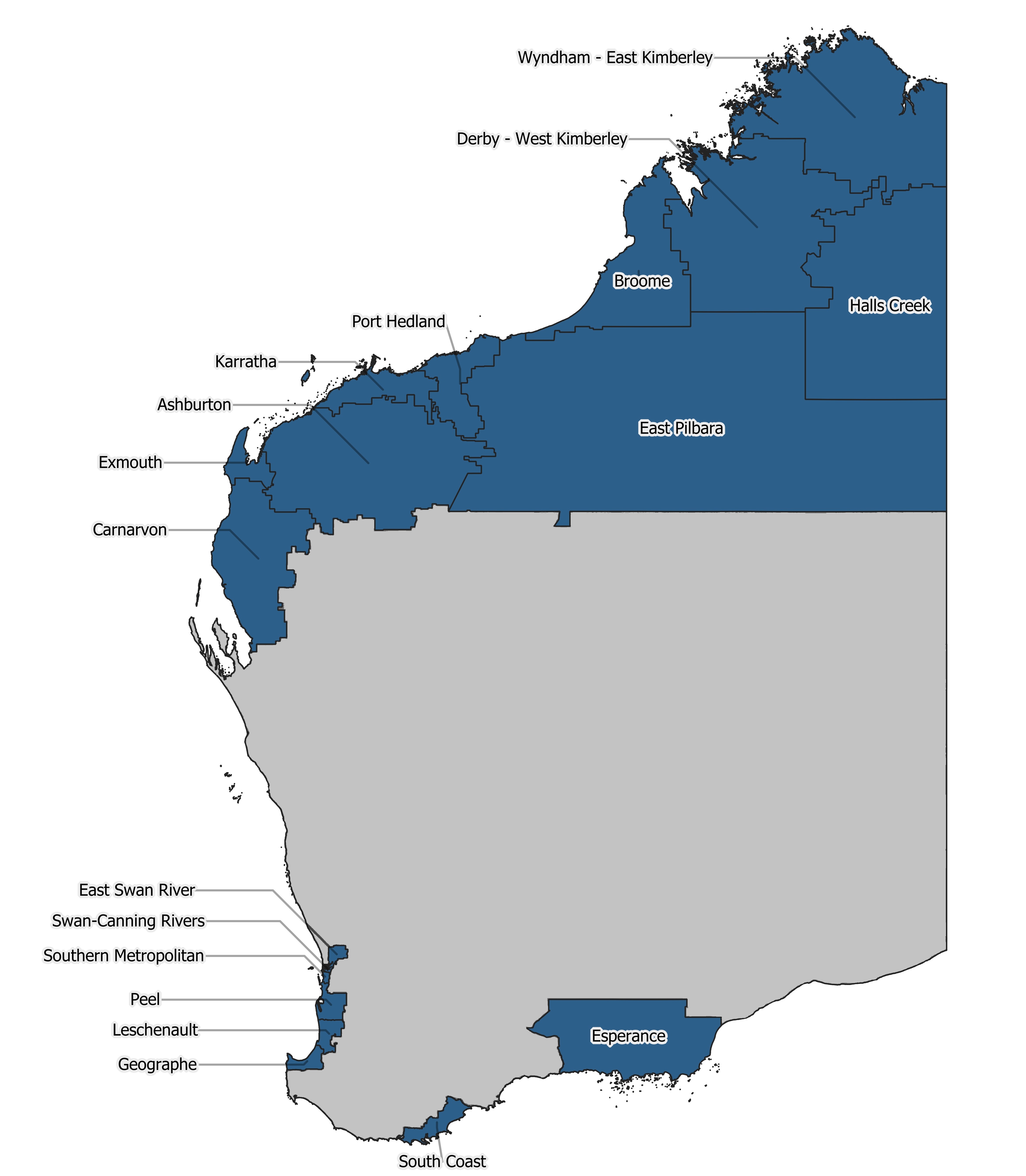 - Peel (Cities of Mandurah and Rockingham and Shires of Murray and Waroona)