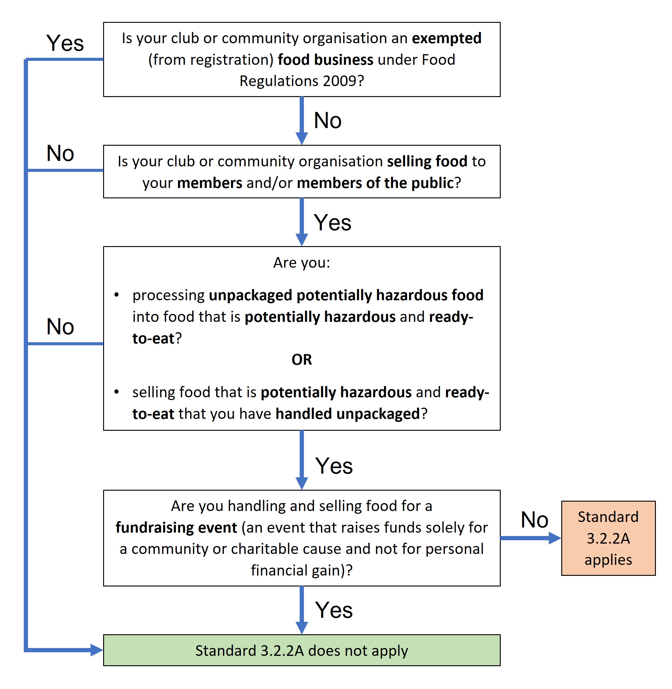 A food business that is an exempted under Regulation 10 of the Food Regulations 2009 will be considered to be a fund raising event and will be exempt from complying with Standard 3.2.2A. These are food businesses that are conducted to raise money solely for purposes that are of a charitable or community nature and handle potentially hazardous food that is cooked and provided for immediate consumption, for example sausage sizzle fundraisers.