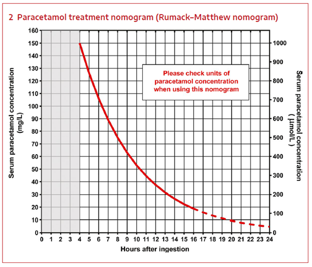 • The risk of hepatotoxicity (without treatment with acetylcysteine) can be determined by plotting the post-ingestion paracetamol level on the nomogram below.